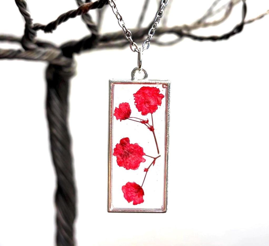 This handcrafted rectangular pendant encapsulates the striking beauty of a delicate crimson red flower, creating a bold, passionate focal point that is both elegant and eye-catching.